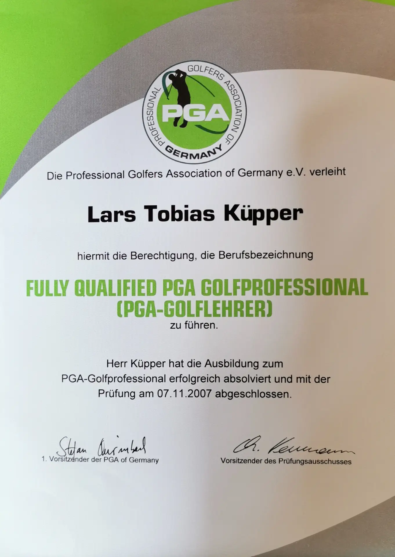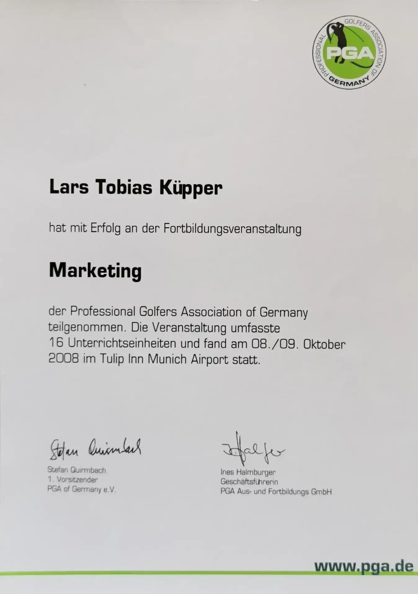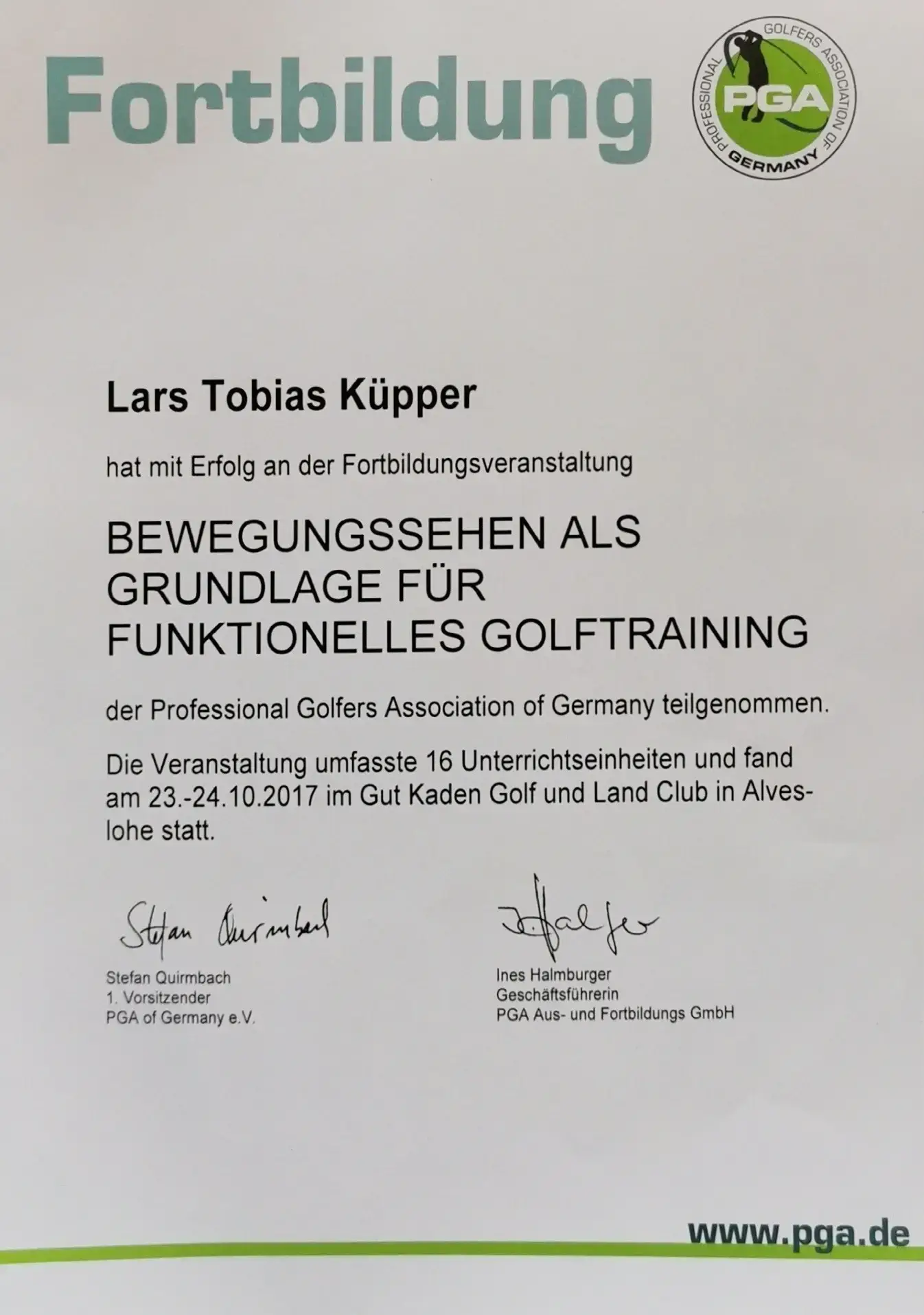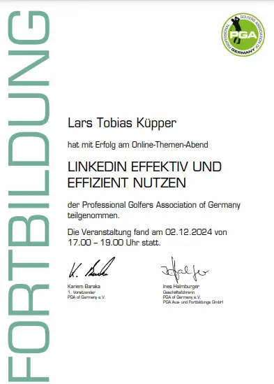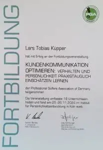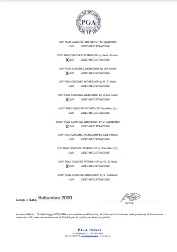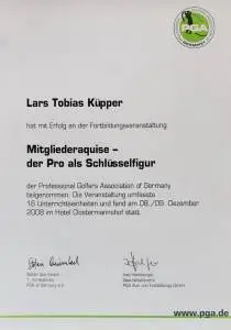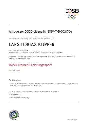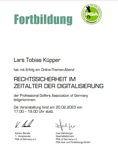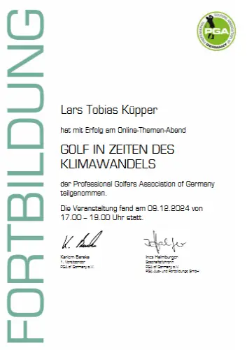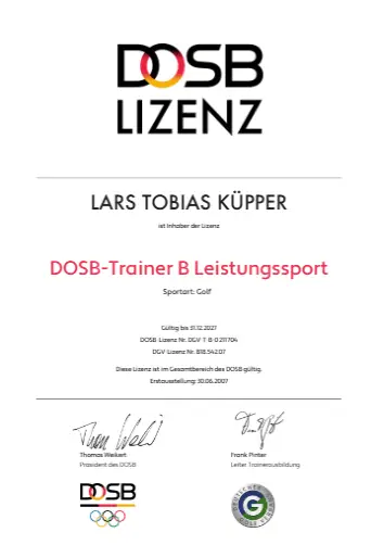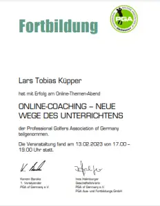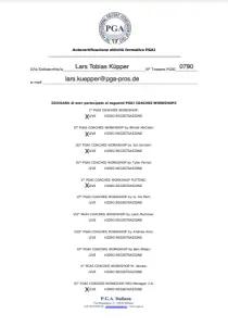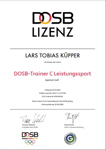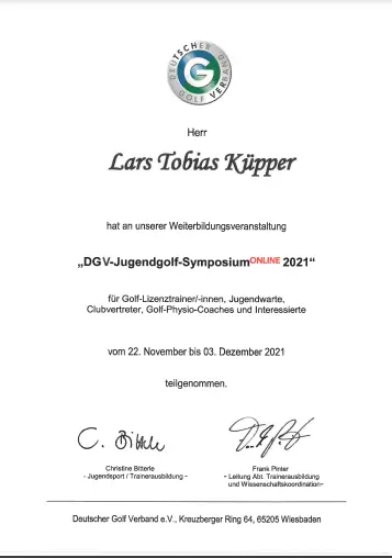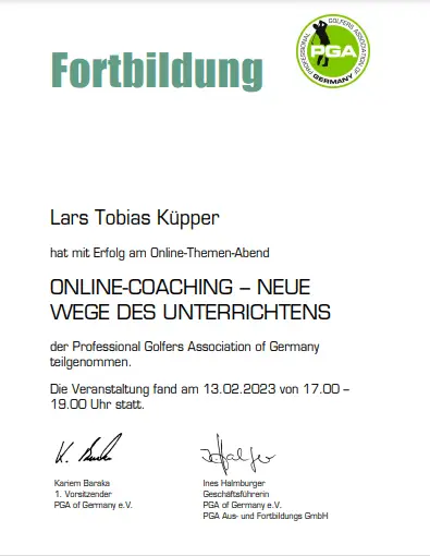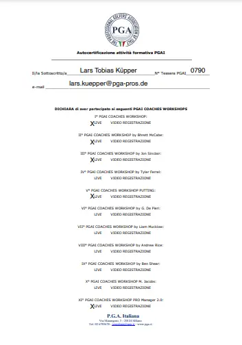 Grazie alla qualifica di istruttore PGA, Lars trasmette le sue conoscenze ai futuri professionisti del golf. Inoltre, ha completato numerosi corsi di formazione presso la PGA tedesca e italiana e ha ottenuto la certificazione in moderne tecnologie di analisi, tra cui TrackMan University, Flightscope e K-Vest.