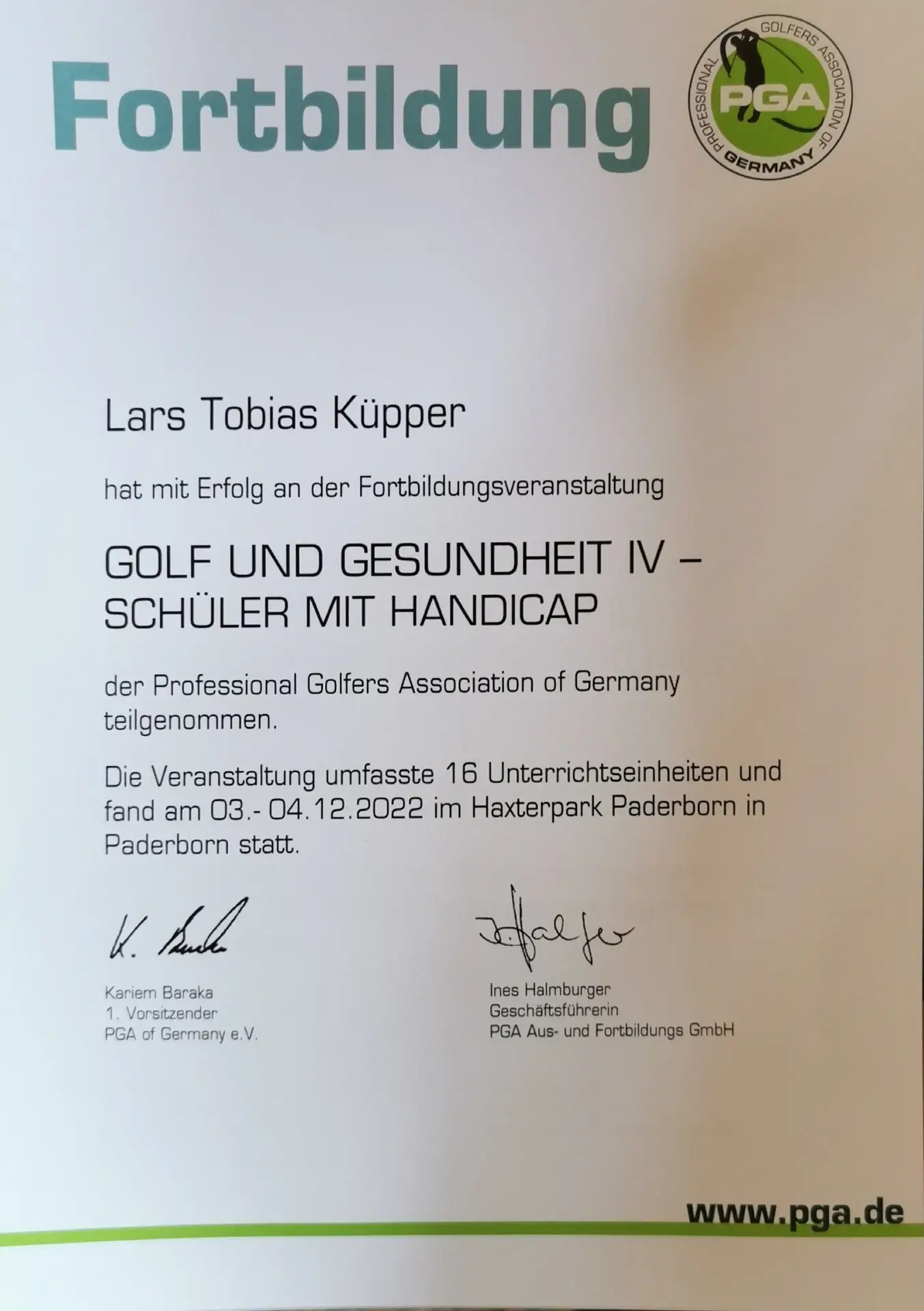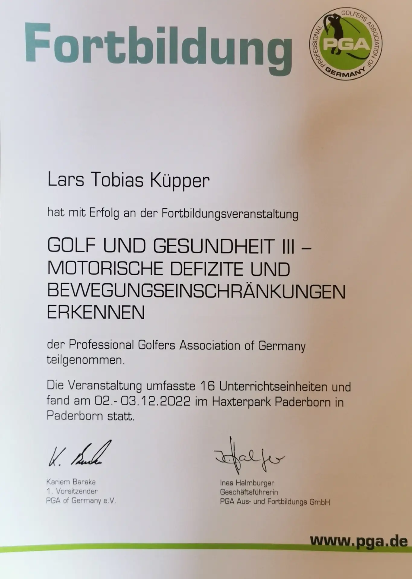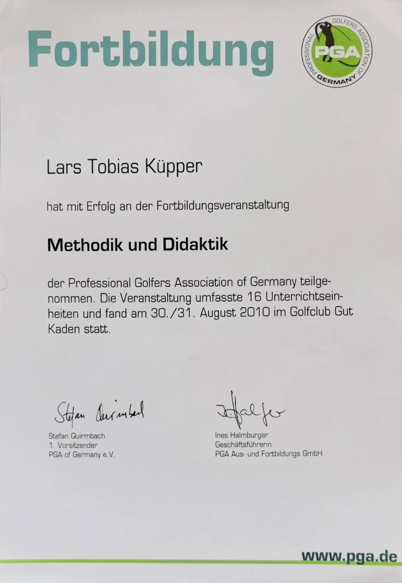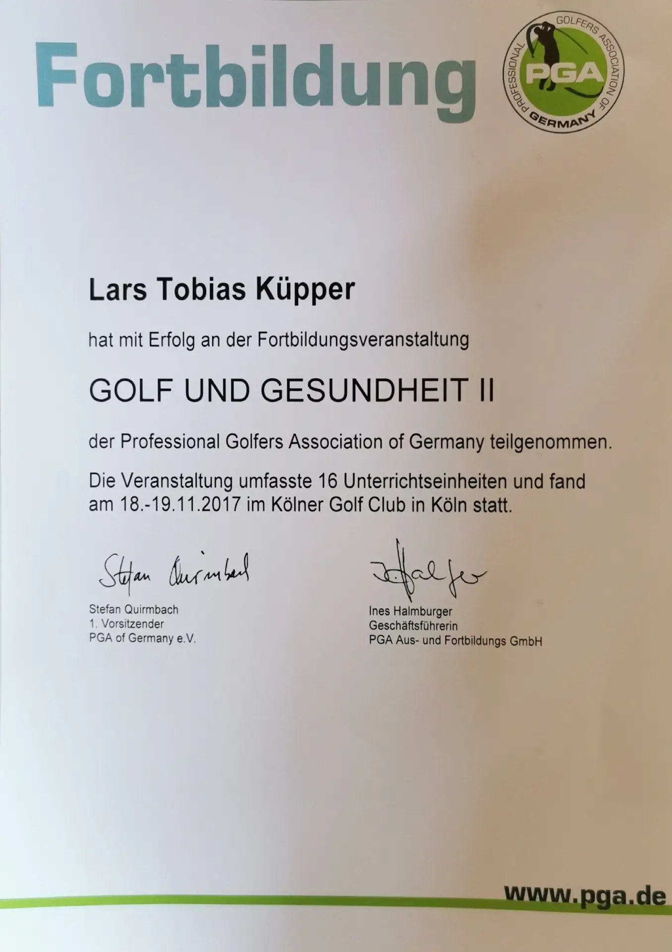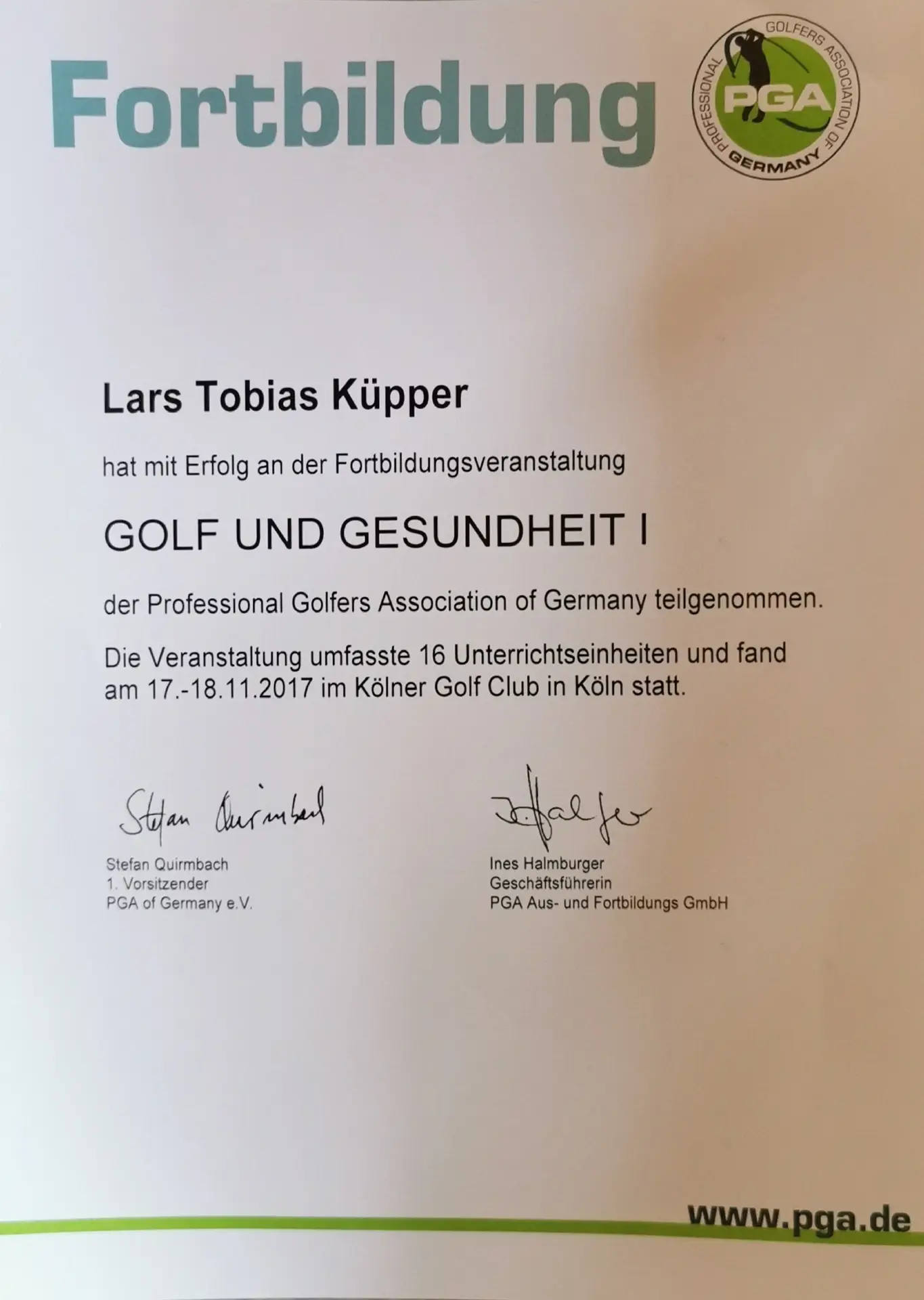 Grazie alla qualifica di istruttore PGA, Lars trasmette le sue conoscenze ai futuri professionisti del golf. Inoltre, ha completato numerosi corsi di formazione presso la PGA tedesca e italiana e ha ottenuto la certificazione in moderne tecnologie di analisi, tra cui TrackMan University, Flightscope e K-Vest.