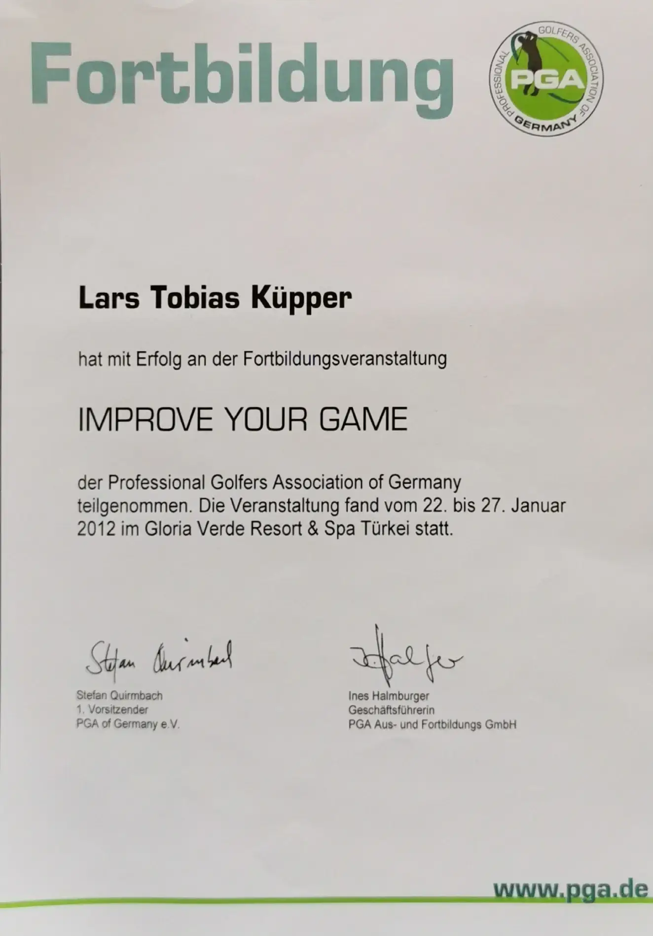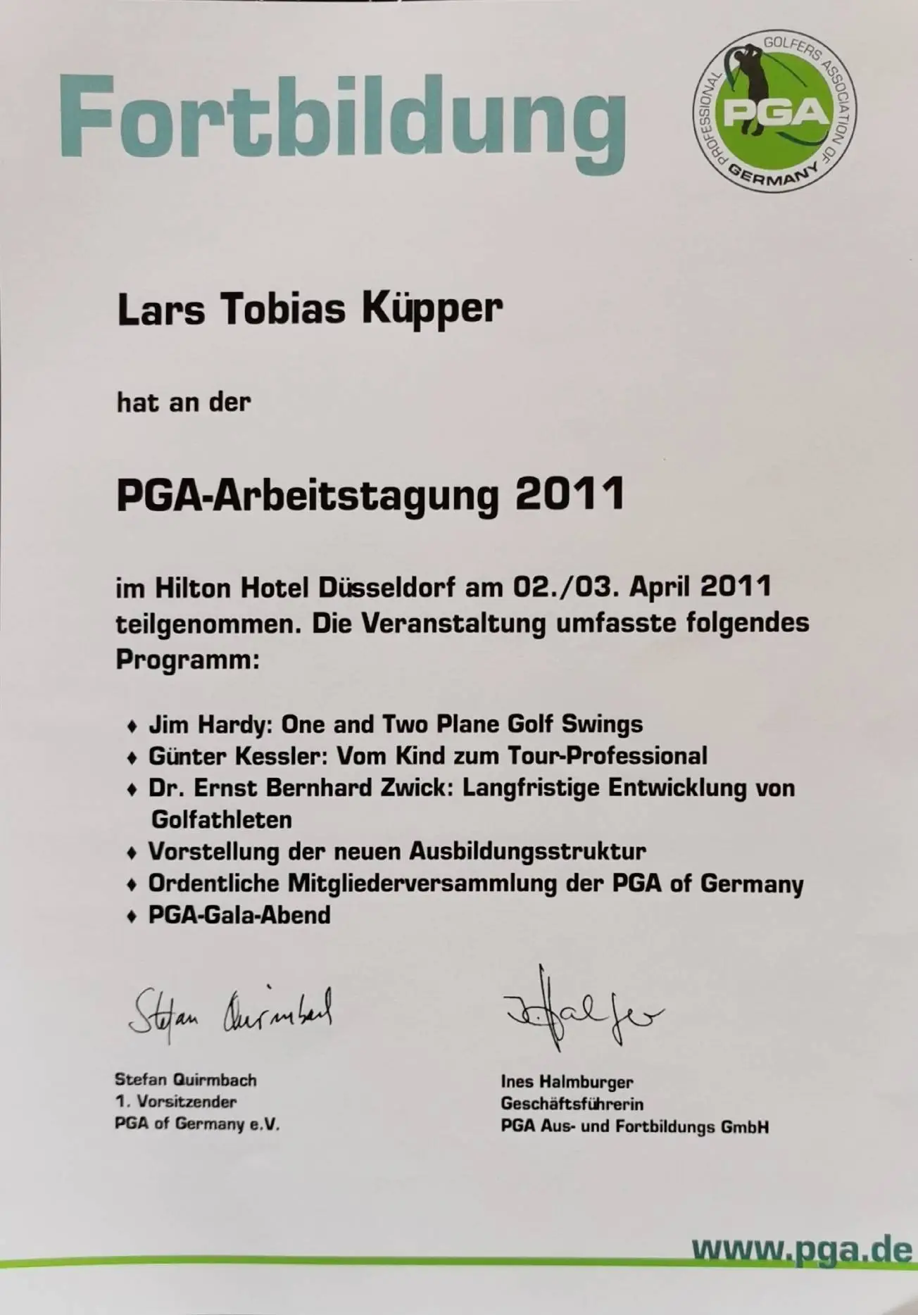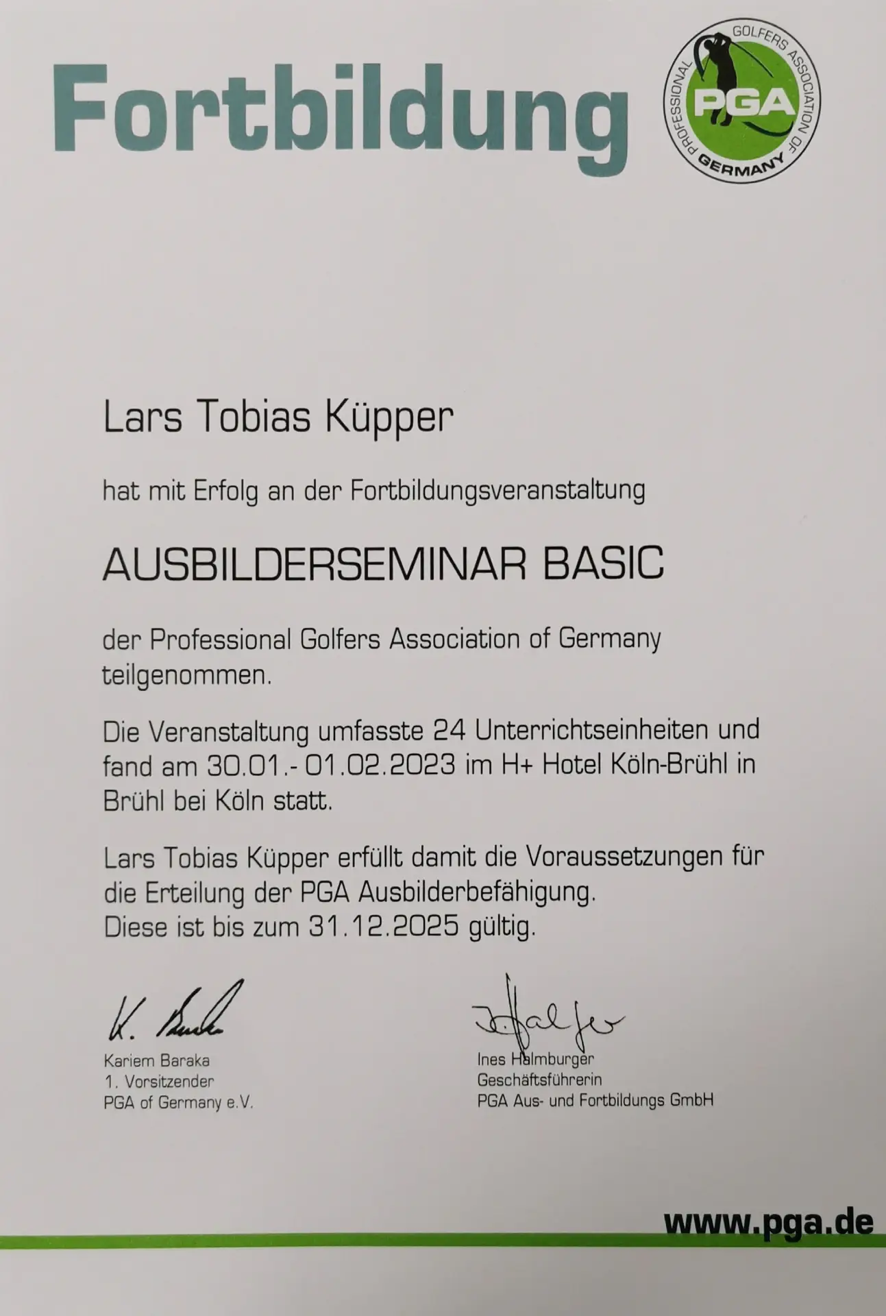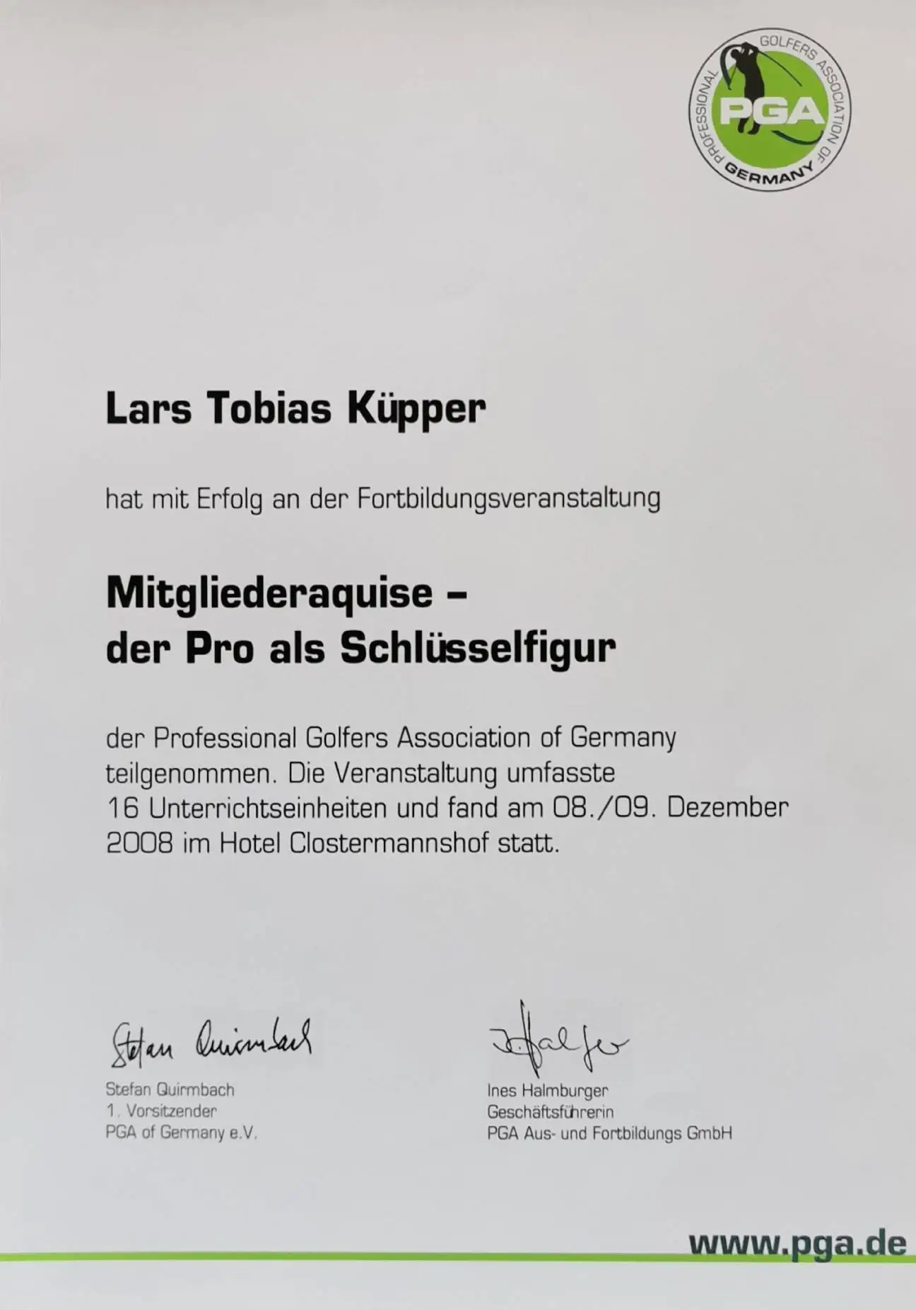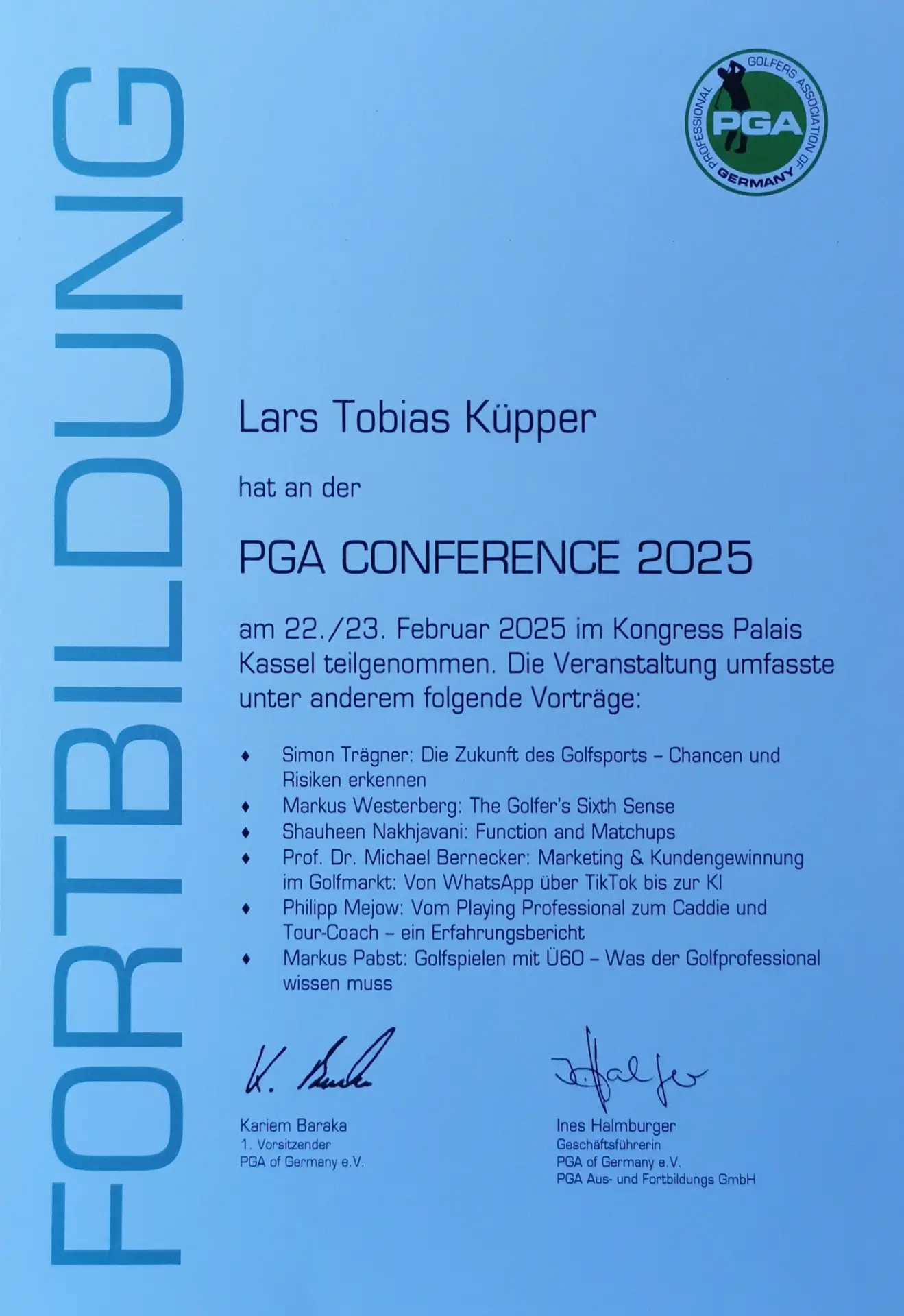 Grazie alla qualifica di istruttore PGA, Lars trasmette le sue conoscenze ai futuri professionisti del golf. Inoltre, ha completato numerosi corsi di formazione presso la PGA tedesca e italiana e ha ottenuto la certificazione in moderne tecnologie di analisi, tra cui TrackMan University, Flightscope e K-Vest.